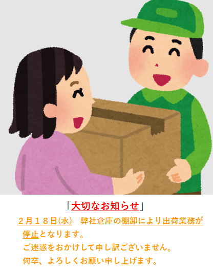 2月18日(水)弊社倉庫棚卸により出荷業務停止となります。