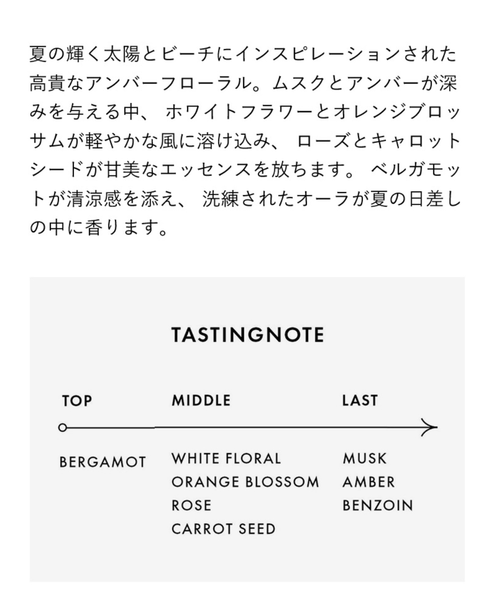 夏 の 輝 く 太 陽 と ビ ー チ に イ ン ス ピ レ ー シ ョ ン さ れ た 高 貴 な ア ン バ ー フ ロ ー ラ ル 。 ム ス ク と ア ン バ ー が 深 みを 与 え る 中 、 ホ ワ イ ト フ ラ ワ ー と オ レ ン ジ ブ ロ ッ サ ム が 軽 や か な 風 に 溶 け 込 み 、 ロ ー ズ と キ ャ ロ ッ ト シー ド が 甘 美 な エ ッ セ ン ス を 放 ち ま す 。 ベ ル ガ モ ッ ト が 清 涼 感 を 添 え 、 洗 練 さ れ た オ ー ラ が 夏 の 日 差 し の中 に 香 り ま す 。