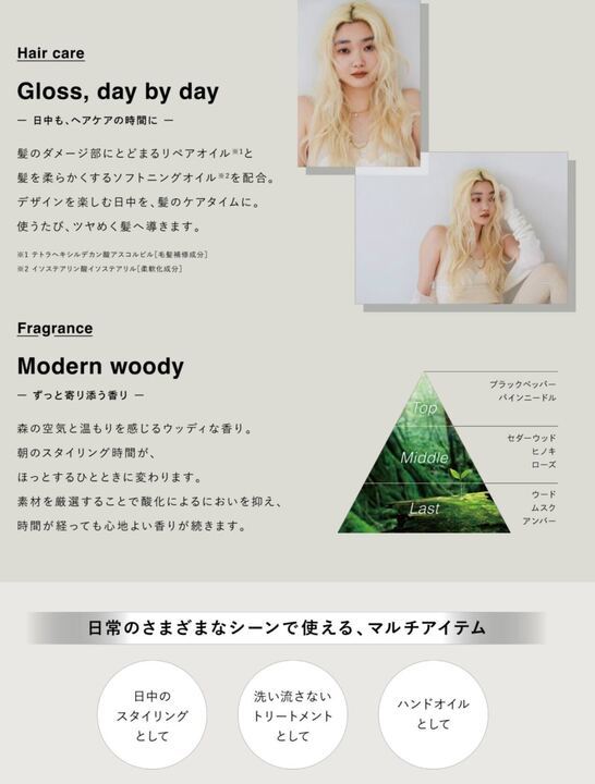 髪を柔らかくまとめ、みずみずしいツヤ感を与えます。